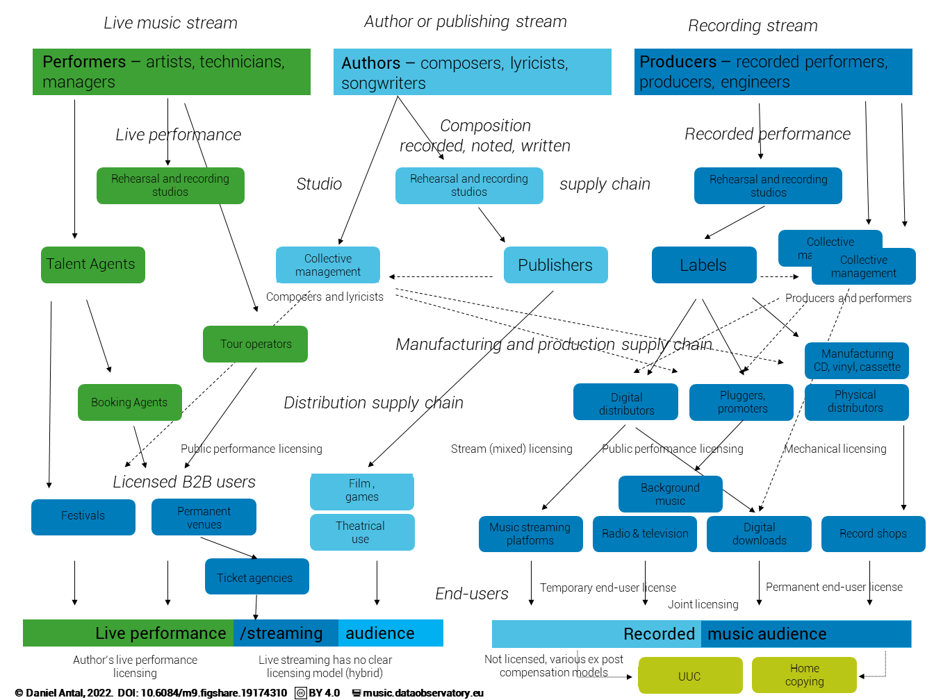 As one can see from our graphic figures, the music business has a particularly complicated value chain, because music is a copyright-based intellectual property with a very complex licensing system. Each music recording is a bundle of copyrights and neighbouring rights, which are often remunerated separately. Furthermore, in terms of the largest volume of use, the user is not paying for it directly. This makes the empirical analysis particularly challenging.