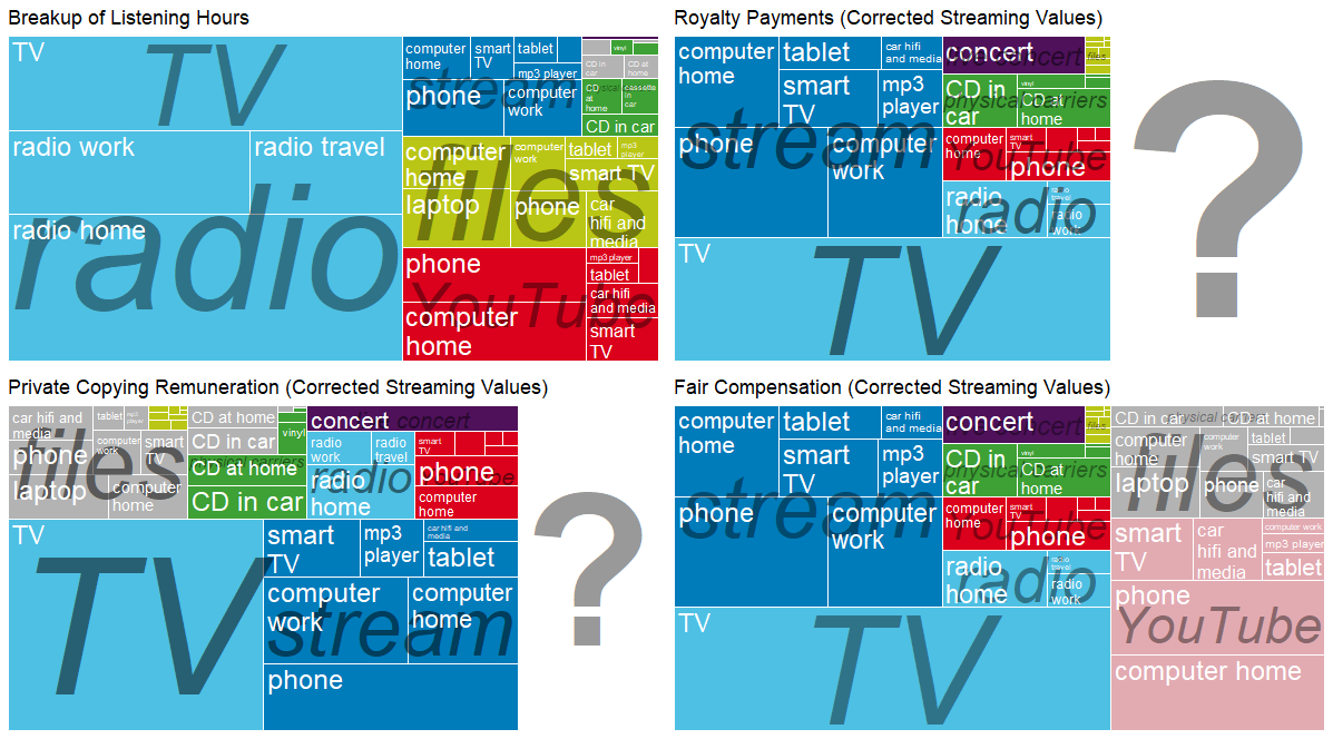 In the market where we have conducted detailed surveys, the biggest volume of music was used in zero-price forms–mainly in radio, followed by UUC streaming, home copying, but also ad-supported music streaming had measurable market shares. The music use overlaps with commercialized forms of music consumption, and participation on non-commercialized or even illegal uses (such a liturgical music, authentic folk music, and some no longer protect classical works, or home copying, which is exempted from copyright law in most European markets, but not in the United Kingdom.)